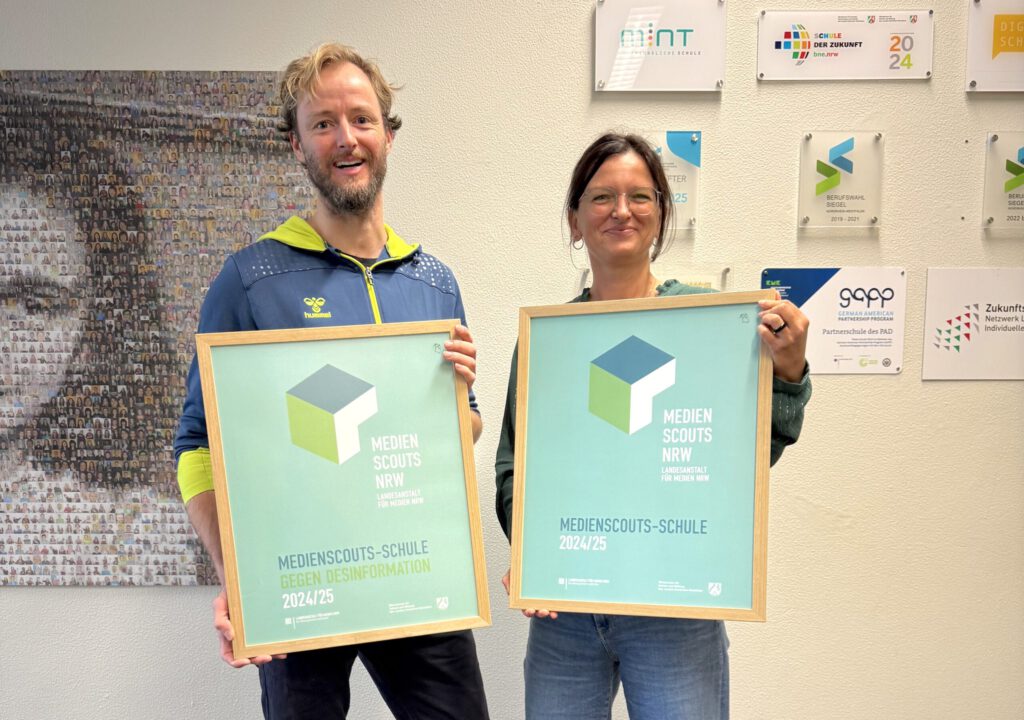 Für dieses große Engagement wurden unsere Medienscouts im Oktober 2025 ausgezeichnet. Das Anne-Frank-Gymnasium hat vom Ministerium für Schule und Bildung des Landes Nordrhein-Westfalen und der Landesanstalt für Medien NRW als eine von 152 Schulen die Auszeichnung „Medienscouts-Schule 2025“ erhalten. Dieses Abzeichen erhalten Schulen, die sich in besonderem Maße für das Angebot Medienscouts NRW engagieren. Zusätzlich wurde die Schule mit einem Zusatzabzeichen für ihren besonderen Einsatz gegen Desinformation ausgezeichnet. Dieses Sonderabzeichen mit dem Namen „Medienscouts-Schule gegen Desinformation“ wurde in diesem Jahr an 54 Schulen in NRW vergeben. Als einzige Schule im Kreis Unna ist hierbei das Anne-Frank-Gymnasium ausgezeichnet worden. Unsere Medienscouts haben hierfür beispielsweise einen Workshop entwickelt, indem Fake-News am Beispiel von Presseberichten über Greta Thunberg und Jan Böhmermann analysiert wurden und Desinformation aufgedeckt wurde.