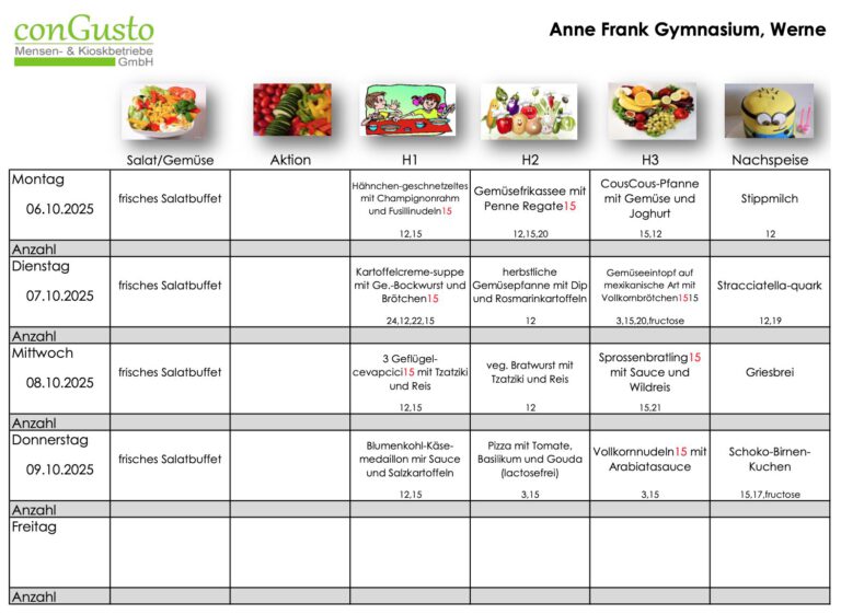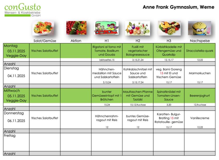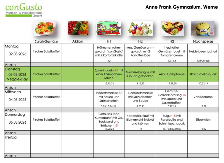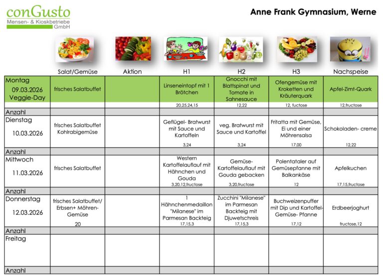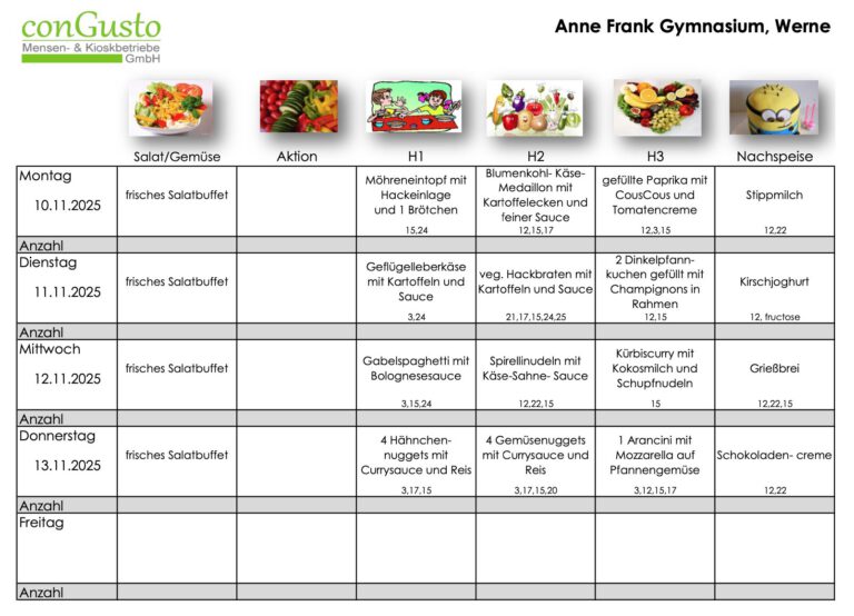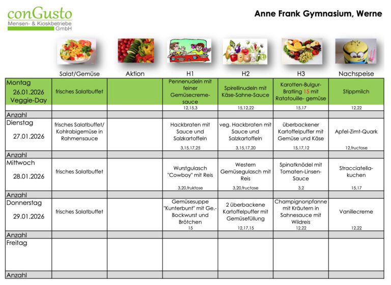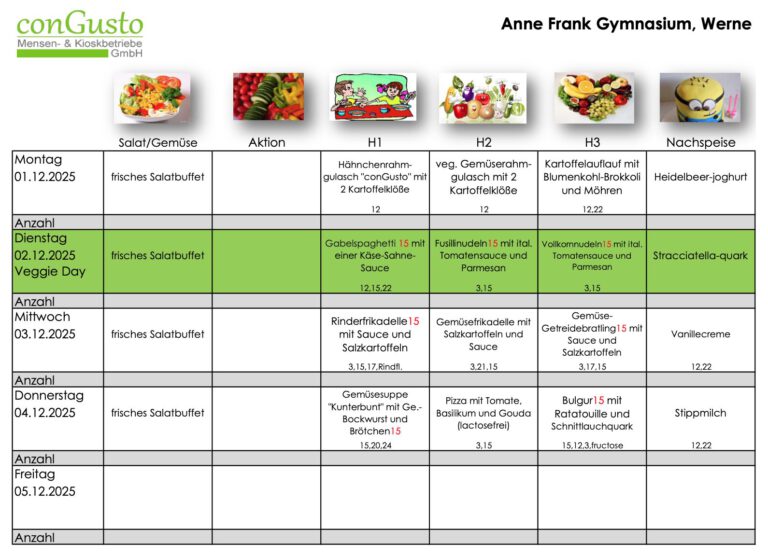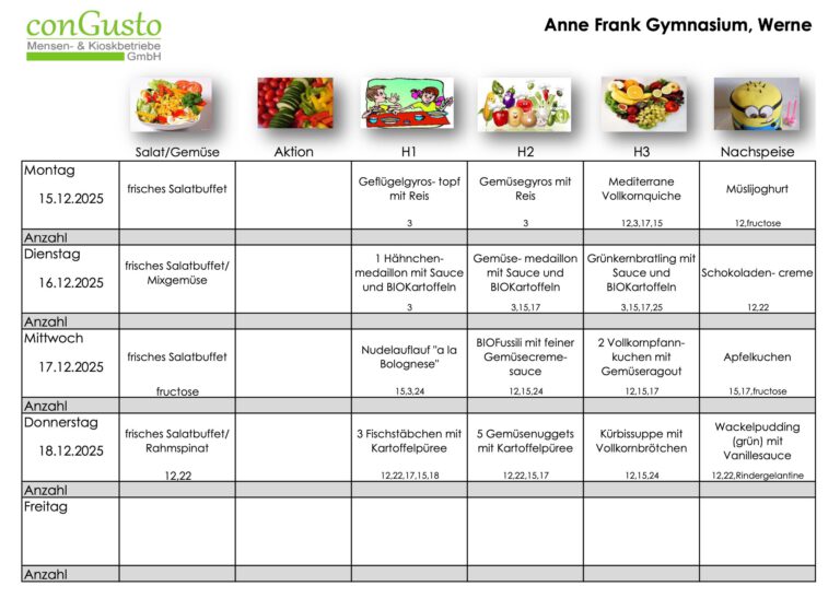 Der Kindergarten- und Schulcaterer conGusto aus Ahlen versorgt die Mensa des Anne-Frank-Gymnasiums täglich mit frischen Mahlzeiten. Zum Verfahren der Anmeldung, der Essensbestellung und der Bezahlung erhalten Sie Informationen im untenstehenden Elternbrief.