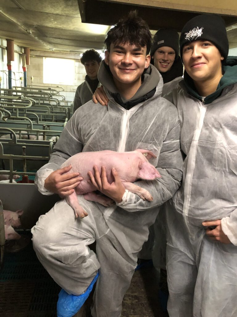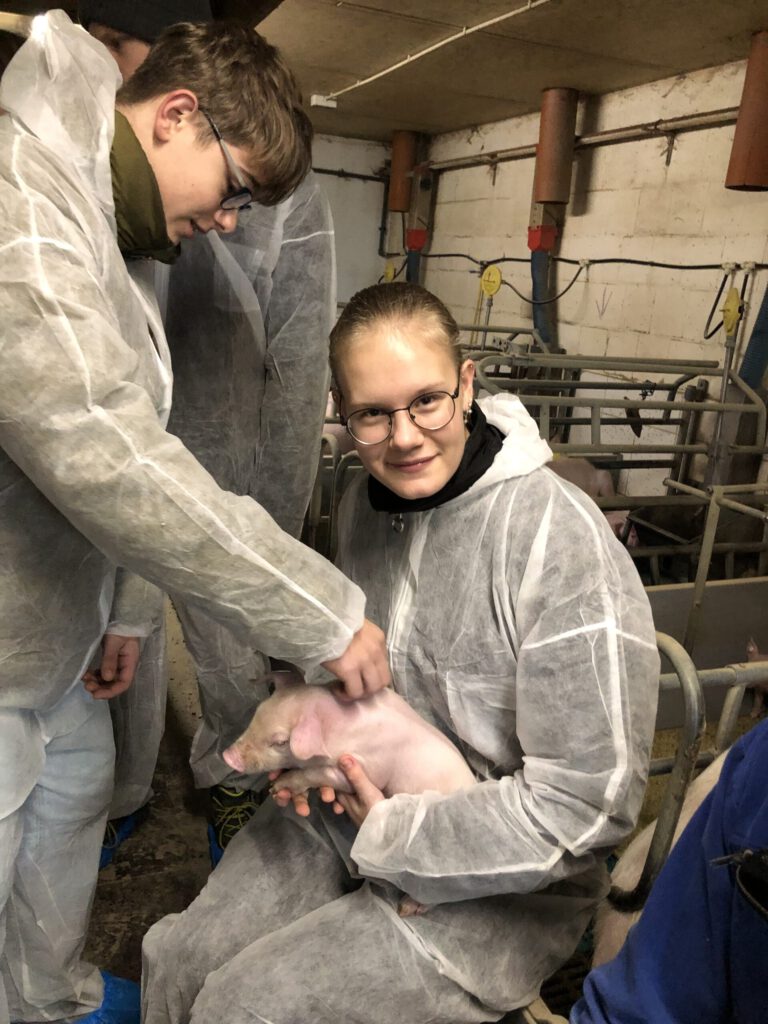 Der Erdkunde-Leistungskurs der Q1, bestehend aus 23 Schülerinnen und Schülern, besuchte am Donnerstag, den 27.11.25, im Rahmen des Unterrichts den außerschulischen Lernort Hof Großerichter in Herbern. Dort konnten die Lernenden zentrale Themen des Lehrplans direkt vor Ort erleben. Der Betrieb hält rund 200 Sauen mit Nachzucht, wobei der Kurs einen Einblick in die verschiedenen Bereiche der modernen Schweinehaltung erhielt – vom Deckzentrum über die Trächtigkeitsphase bis hin zur Ferkelaufzucht. Dabei wurde deutlich, wie wichtig Technik, Fütterungsmanagement und sorgfältige Hygiene für Tierwohl und Tiergesundheit sind.
