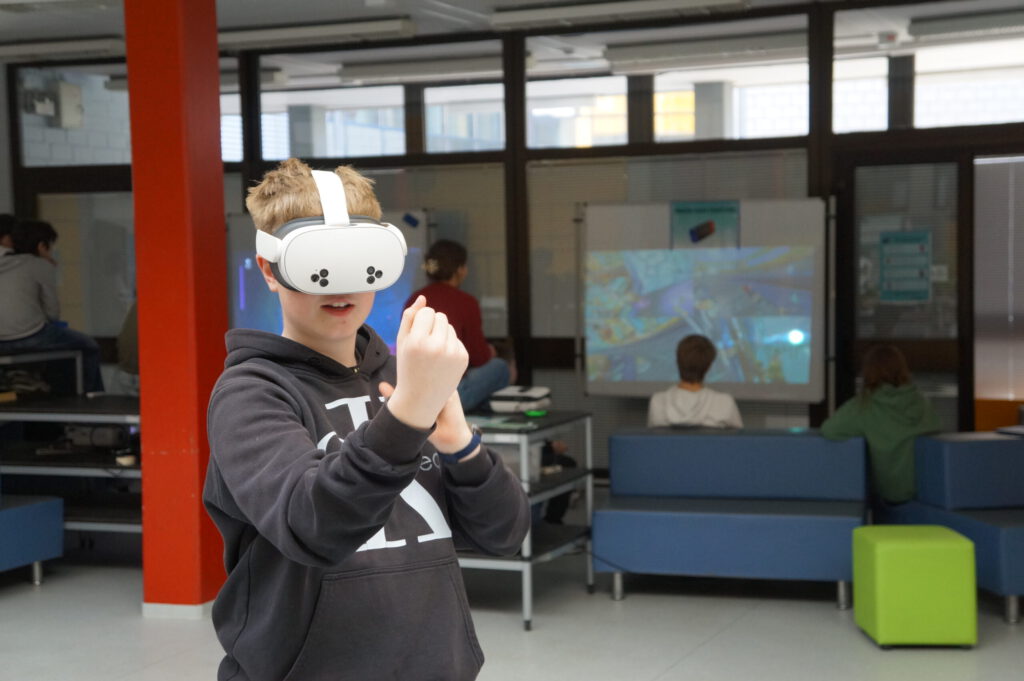Bei den Shifties sollte zum Beispiel ein Handy mit nur sechs Apps gebastelt werden, so dass man sich gut überlegen musste, welche Apps man eigentlich wirklich täglich braucht. An der VR-Station ging es eher darum, wie Medien für Entspannung und Kreativität genutzt werden können: nur mit Hilfe einer VR-Brille und dem eigenen Zeigefinger konnte dort ein Bild in die Luft gezeichnet werden, das für Zuschauende auf einem mobilen Bildschirm live mitverfolgt wurde. Begleitet wurde das immersive Erlebnis von den aktuellen Medienscouts aus der Oberstufe, für die „moderne Medienschulung ein wichtiger Baustein der Zukunft in Schule“ ist.