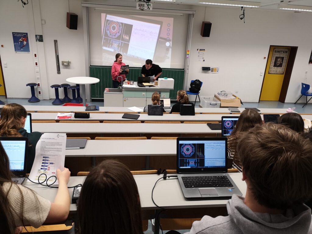 Nach einer kurzen Pause startete die Gruppe mit dem eigentlichen Projekt – der Bestimmung der Masse eines Z-Bosons. Dafür arbeiteten die Schülerinnen und Schüler mit echten Messdaten, die vom CERN aus dem ATLAS-Experiment zur Verfügung gestellt wurden. So konnten sie selbst in die Rolle von Forschenden schlüpfen und einen Einblick in aktuelle wissenschaftliche Arbeitsweisen gewinnen.
