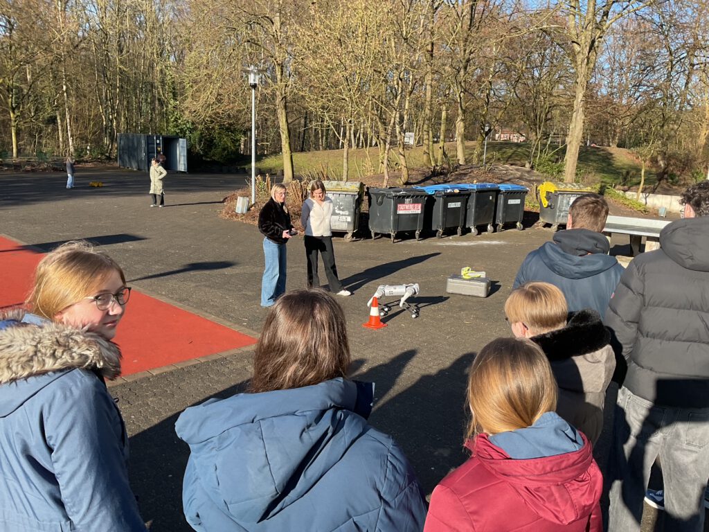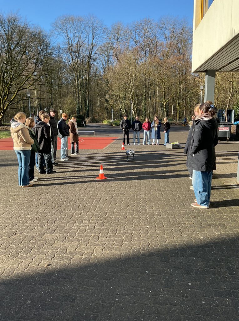Besonders beeindruckend war für viele der Schülerinnen und Schüler der praktische Teil: Sie durften selbst einen Roboterhund steuern, der in der realen Vermessung beispielsweise bei einsturzgefährdeten Gebäuden eingesetzt wird. Das Gerät ermöglicht Messungen in Bereichen, die für Menschen zu gefährlich wären, und zeigt eindrucksvoll, wie technologische Innovation und mathematische Präzision Hand in Hand gehen.