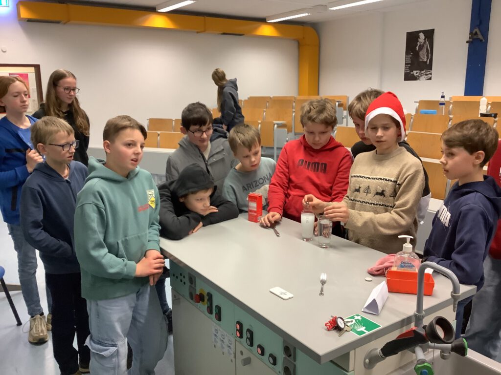 In den Schulpausen trafen sich die Teilnehmerinnen und Teilnehmer, um unterstützt durch Herrn Breimann und Frau Schmitz gemeinsam die Versuche des Tages durchzuführen und die Ergebnisse zu besprechen. Auch nach Schulende war noch lange nicht Schluss. Über unseren Chatmessenger Talk hielten sich die Gruppen auch an den Wochenenden auf dem Laufenden. Selbst als die Weihnachtsferien bereits begonnen hatten, blieb die Motivation hoch. Bis zum 24. Dezember wurde gemeinsam geknobelt, um auch die letzte knifflige Aufgabe zu lösen.