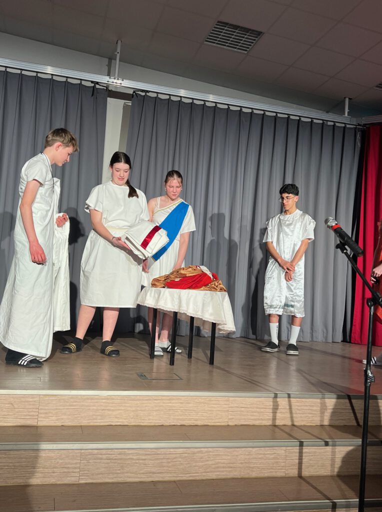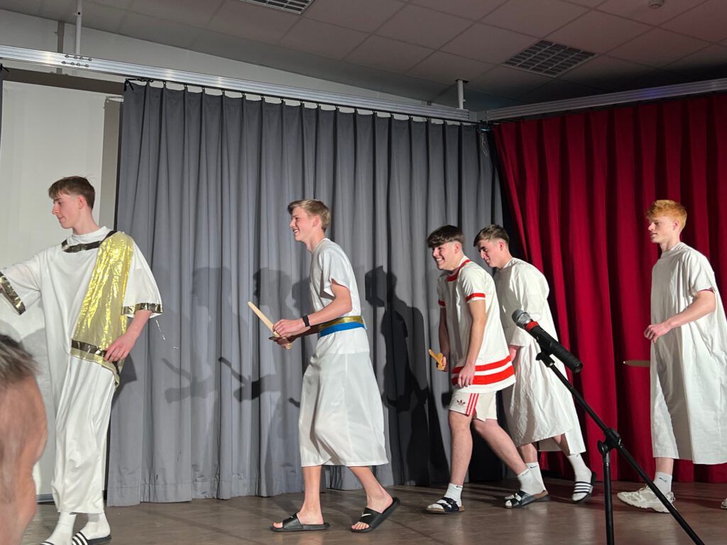 Vor vollbesetzter Mensa traten an beiden Abenden jeweils knapp 100 Schülerinnen und Schüler in fünf verschiedenen Stücken auf und unterhielten das Publikum mit ihren verschiedenen Darbietungen. Vor der Pause führten Schülerinnen und Schüler der Stufen 7 und 8 und die Klasse 10c Szenen aus dem römischen Alltagsleben auf, darunter Episoden aus dem Leben eines Sklaven in der Stadt und eines Sklaven auf dem Land, außerdem präsentierten sie ein Stück über die ein römisches Familienfeste, bei dem ein Junge seine erste Männertoga erhält, und eine Liebesgeschichte zwischen einer jungen vornehmen Römerin und ihrem Verehrer.