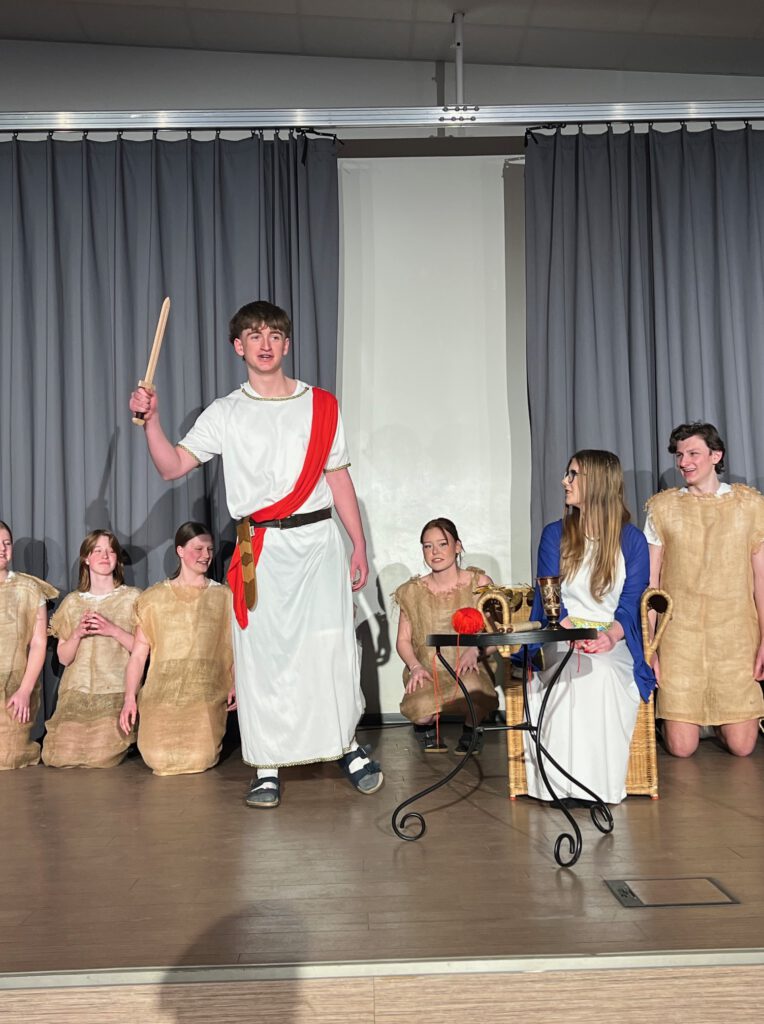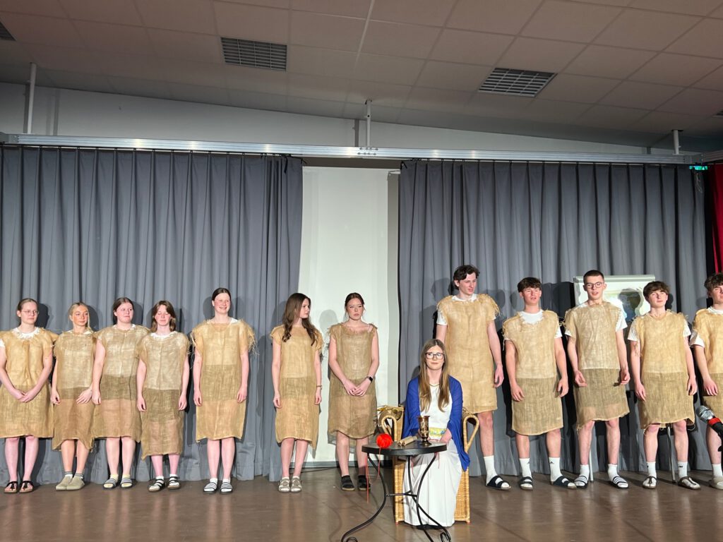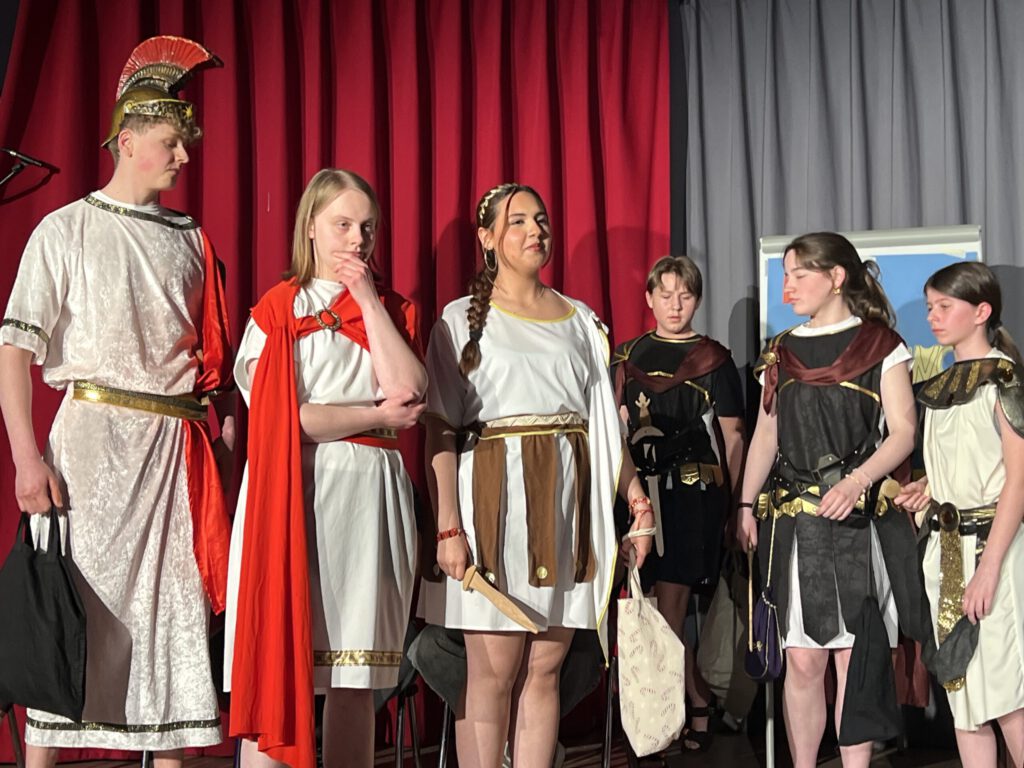 Die lateinische Theater AG, die derzeit aus über 20 Mitgliedern von der Stufe sechs bis zur Q1 besteht, lüftete als letzte Gruppe in ihrem Theaterstück die Rätsel um die Eroberung Trojas und das trojanische Pferd. Besonders hervorzuheben sind hier die schauspielerischen Leistungen von Linus Müller als Agamemnon und Toria Lehmkämper als Odysseus. Auch einige junge Darstellerinnen aus der Stufe 6, die offiziell noch gar kein Latein lernen, verdienen ein besonderes Lob, da sie verschiedene kleinere Rollen mit Bravour meisterten. „Mit Latein kann man eben nie früh genug anfangen“, so bemerkte Birgit Berendes trocken.