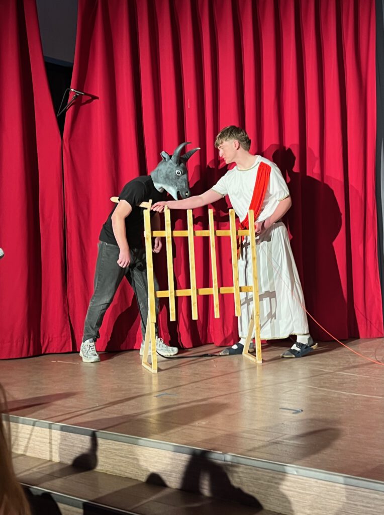 Nach einer Pause, in der sich das Publikum an römischen Leckereien stärken konnte, wurde es dann mythologisch. Die Stufe EF entführte das Publikum auf die Insel Kreta und führte schon die oben erwähnten Sagen von Dädalus und Ikarus, dem König Minos und seinem Monster Minotaurus auf. Der Minotaurus wurde schließlich von Theseus besiegt und wurde dabei tatkräftig unterstützt von Ariadne, denn nur dank ihrer Hilfe mit einem roten Faden fand Theseus aus dem Labyrinth, in dem der Minotaurus gehalten wurde, wieder heraus. Birgit Berendes, die den Abend moderierte und in die Stücke einführte, gab den Zuschauern zwischendurch weitere Erklärungen, so dass man der Handlung besser folgen konnte, auch wenn einem die Mythen gänzlich unbekannt waren.