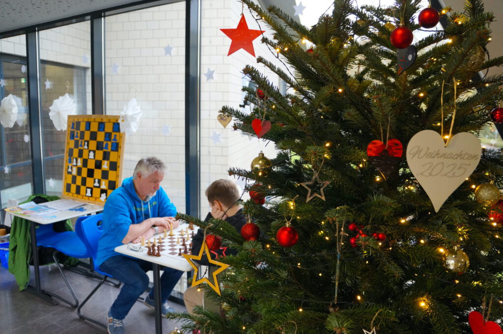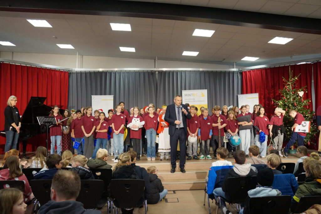 Am Samstag, den 29. November, hat das Anne-Frank-Gymnasium seine Türen für interessierte Schülerinnen und Schüler der 4. Klasse und ihre Familien geöffnet. Die Besucherzahl war noch einmal deutlich höher als im letzten Jahr, so dass bei der Begrüßung morgens kaum alle in die Mensa passten. Gut gelaunt eröffnete Schulleiter Marcel Damberg auf der weihnachtlich geschmückten Bühne den Tag der offenen Tür und hieß alle Gäste herzlich willkommen. Wie auch in den letzten Jahren standen dann die 5. Klassen im Mittelpunkt und sangen stolz den AFG-Song unter Begleitung von Musiklehrerin Iris Leifkes am Klavier. Das Publikum klatschte begeistert mit und startete anschließend beschwingt einen Rundgang über das Schulgelände, der von Schülerinnen und Schülern der Oberstufe durchgeführt wurde. Sie beantworteten dieses Mal viele Fragen zu Fahrten und Austauschen am AFG und wurden gebeten ausführlich über das gute Schulklima zu berichten.