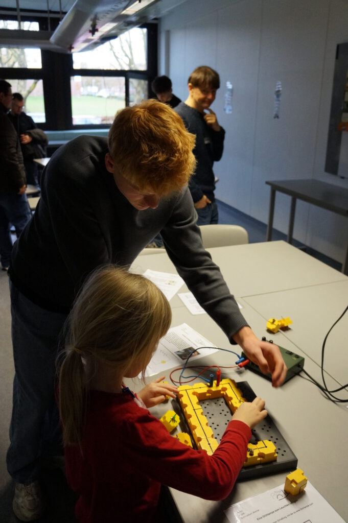 Das Highlight waren am Ende die Stationen im MINT-EC-Raum, wo die jungen Besucherinnen und Besucher an einem Glücksrad drehen und je nach Farbe ein Experiment der neuen MINT-Boxen durchführen durften. Marius Gregg vom MINT-STuBO-Team freute sich sehr, dass die Boxen so gut ankamen und der Raum bis weit in die Mittagspause noch gut gefüllt war.
